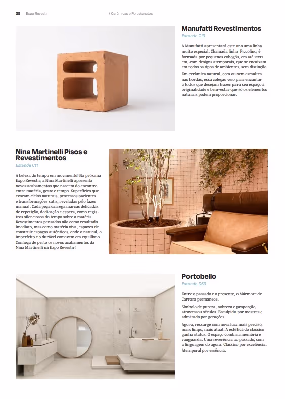 Preview Expo Revestir brings together a special curation of the main launches that will mark the year and will be exclusively featured in the next edition of the fair. The initiative offers the public a preview of the innovations, trends, and solutions that reinforce Expo Revestir's leading role as a platform for business, content, and inspiration for industry professionals!