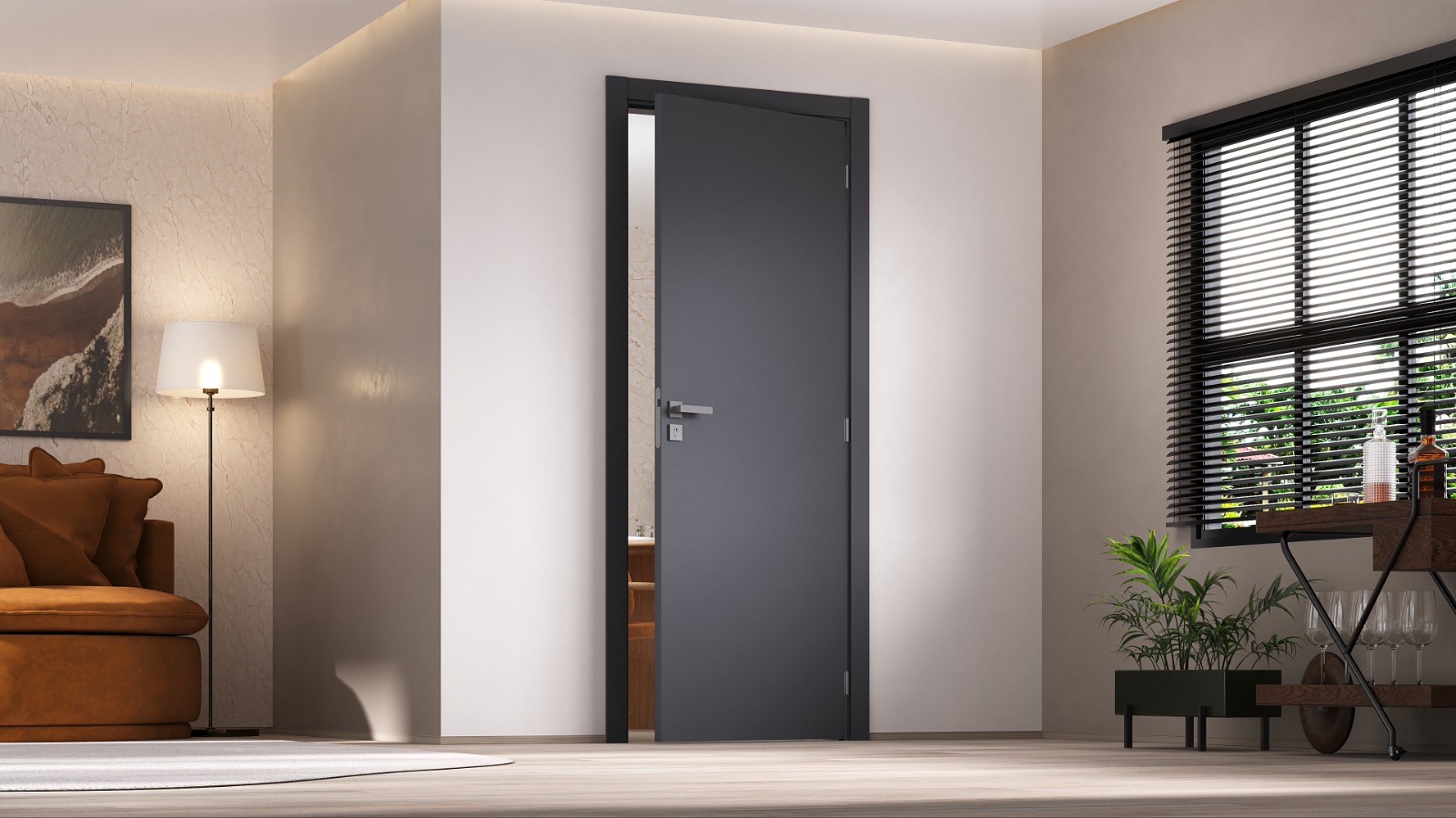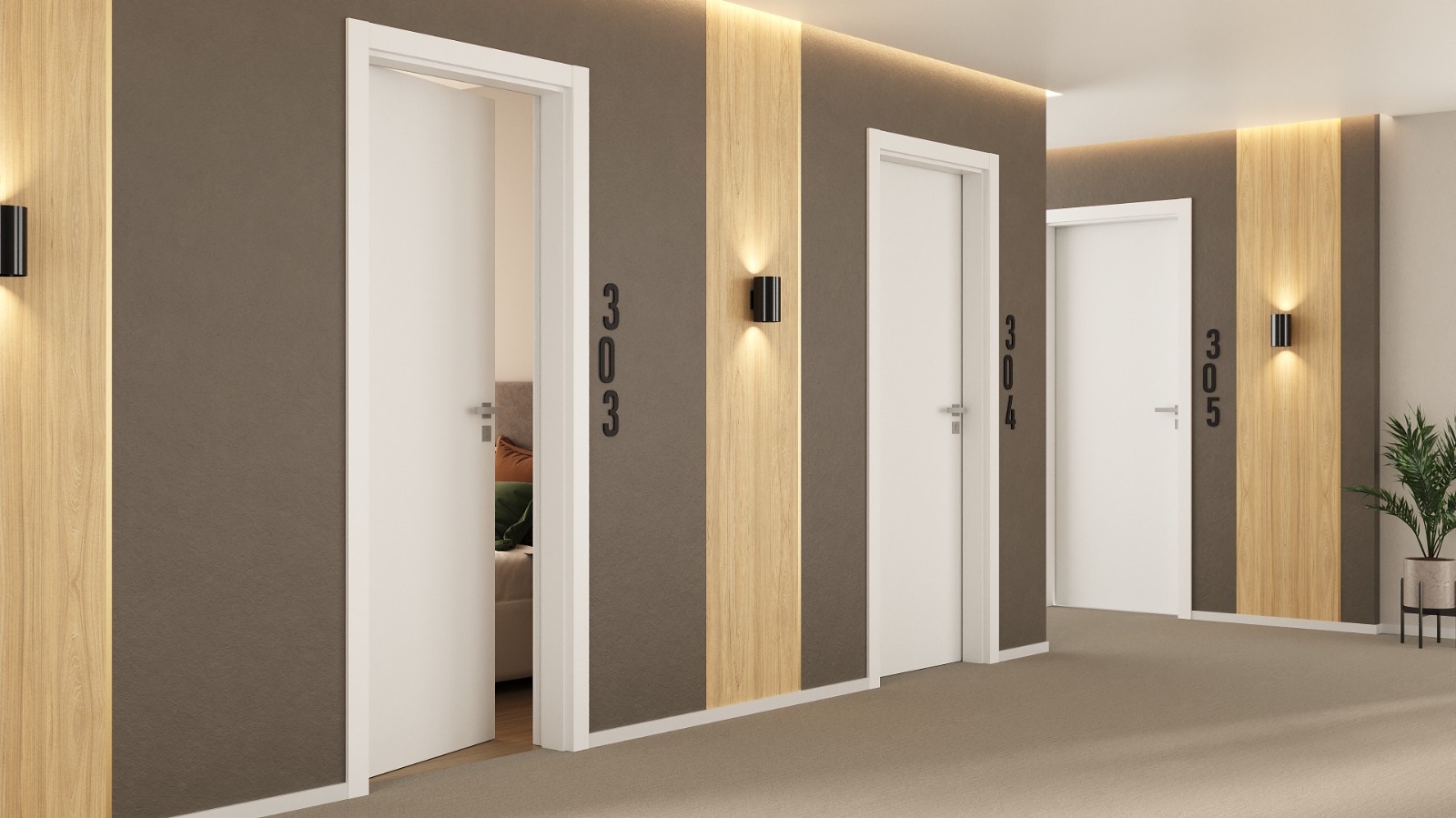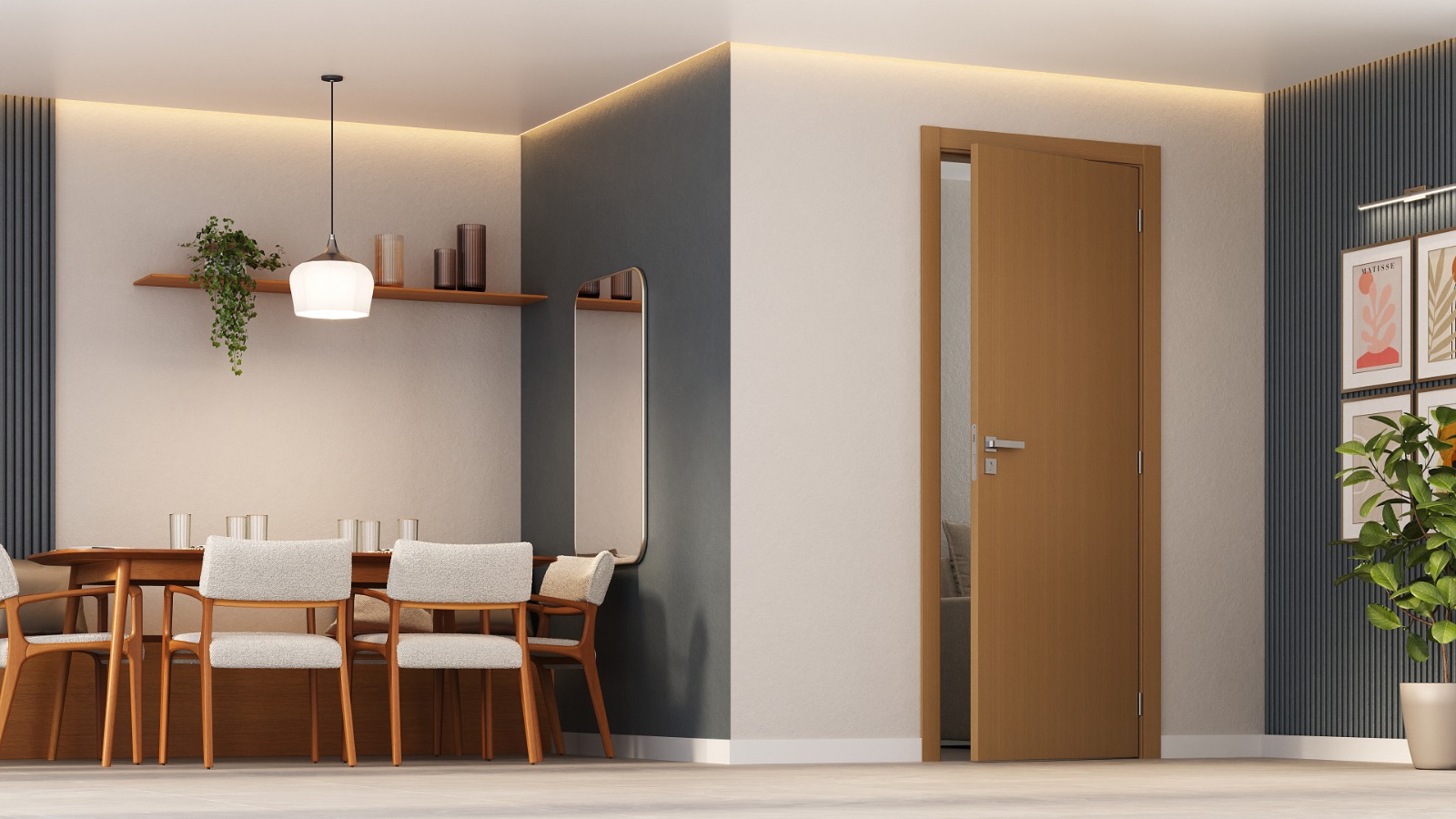 Safety is also a central pillar of the exhibition. The company highlights the Porta PRF 30, a certified model that offers 30 minutes of fire resistance, meeting demanding technical standards without compromising aesthetic finish. In addition, the brand reinforces its commitment to production efficiency through the Porta com Miolo Colmeia, designed to offer lightness and sustainability on a large scale.