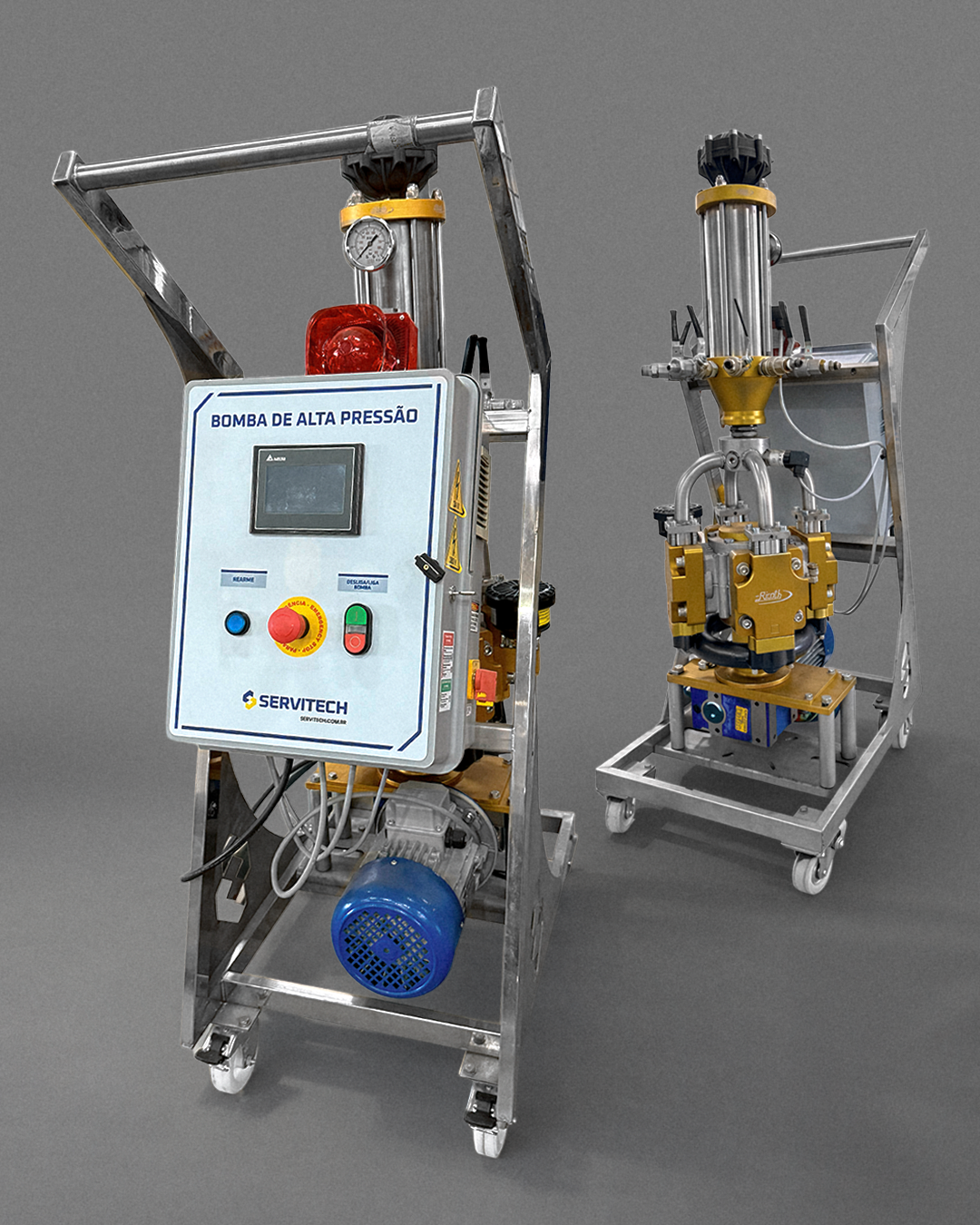 1. 4-Piston High Pressure Pump: developed for airless applications with greater pressure and flow capacity, it is ideal for more sprayed enamels or higher volume lines. With low rotation, the equipment offers more stability, greater component durability, and a much more homogeneous application. This feature reduces mechanical wear, decreases maintenance downtime, and increases the equipment's service life.